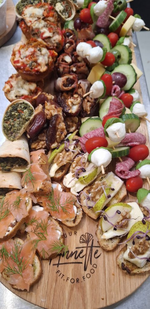 Hapjesplank bruchetta zalm en brie, spies kaasvlees, spinaziehoorntje, pizza muffin en dadel geitenkaas walnoot