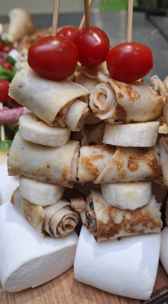 Pannenkoekrepen met spekje, banaan en tomaatje.